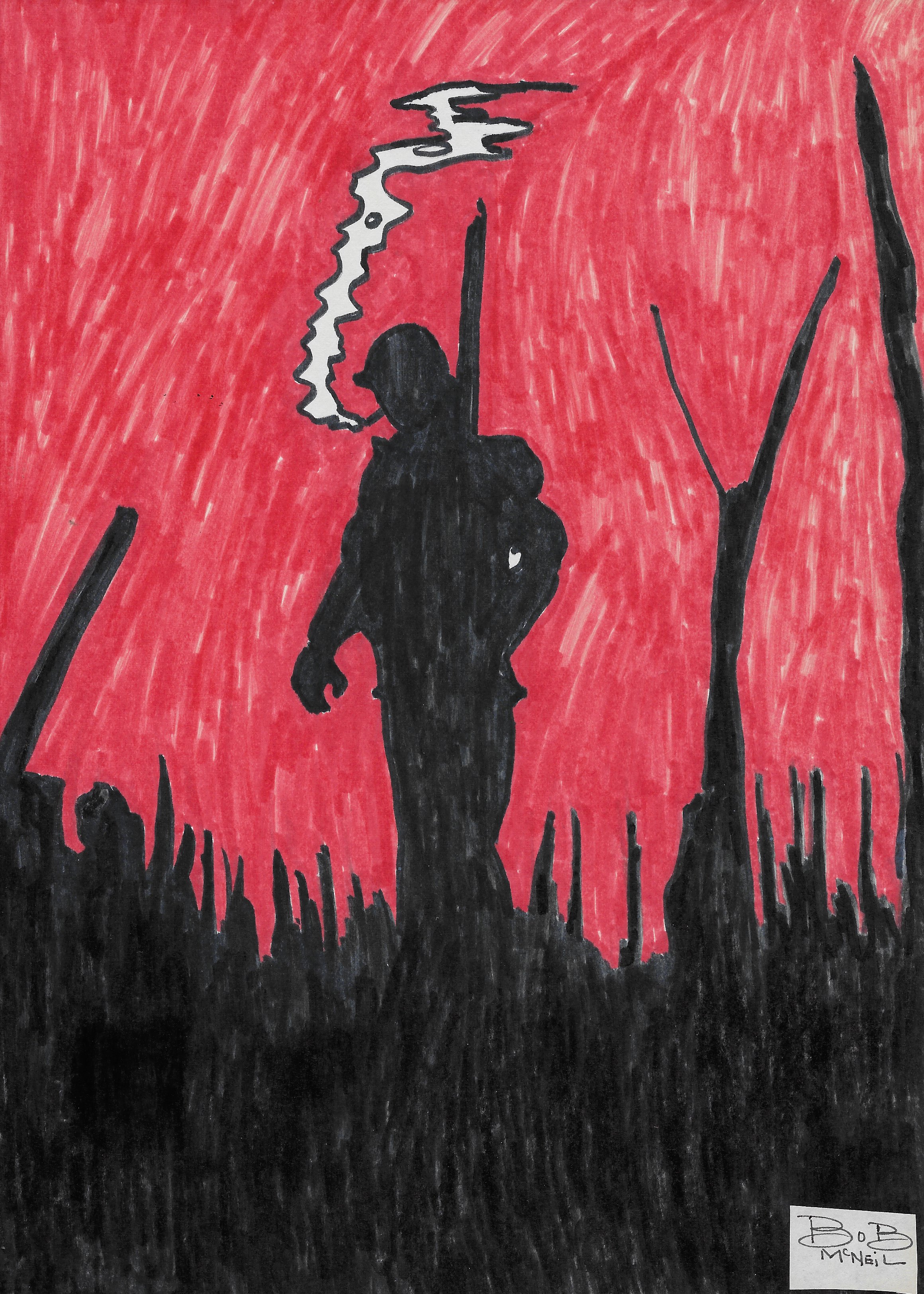 My…The Soldier looks as if he’s posted dutifully for his death on a stake, blood spattered all around, and his military family below, which looks like , a forest of sharp, piercing objects instead of guns. He has a cigarette, as if to say, death is imminent, so I’ll have this last smoke…DEEP PIECE. As I have military family, I view this piece, solemnly. I commend Brother McNeil for it’s expressive existence, as well as it’s proceeds are going towards a worthy cause. Well done!